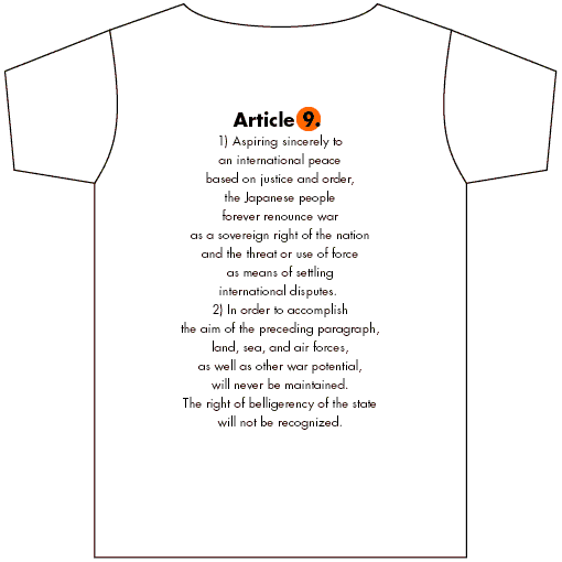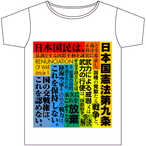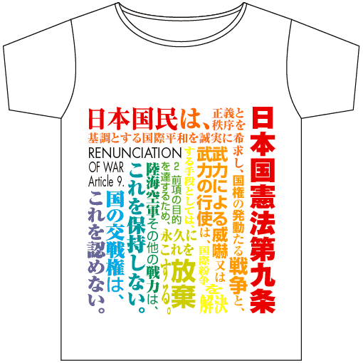 | 憲法九条をはやらせよう!ということからスタートした話に思わずノッて、いくつかデザインしてみました。皆さんからのデザイン案もお待ちしております。(JPEGまたはGIFフォーマットで送信してくださいませ!)また、BBSでの話にもあったように、憲法九条やTシャツにこだわらず、面白いアイデアがあれば、どんどんお知らせください。これは!というものを掲載させて頂きたく思います。 また、ここにあるのはデザイン案だけですが、実際にTシャツを制作・販売してくれる人も大歓迎です! よろしくお願いします。⇒mailto:takekawa@cain-j.org |
